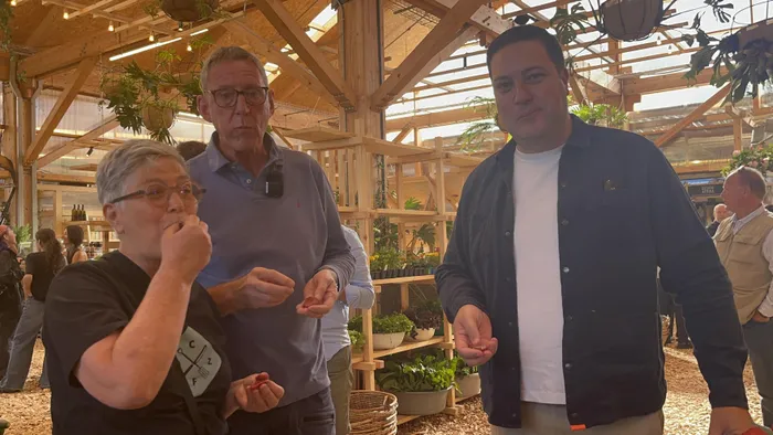 Oranjezicht City Farm Market founder and co-owner Sheryl Ozinsky, V&A Waterfront chief executive officer David Green, and Mayor Geording Hill-Lewis eat some litchies at the relaunched venue of the market, at the Waterfront, Breakwater Pavilion, roof top level.