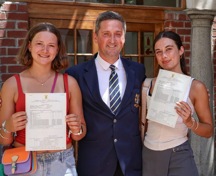 Pictured in the middle is Hoërskool Jan van Riebeeck principal Pieter Rademeyer, with matriculants Stella Malan and Lila Simpson.