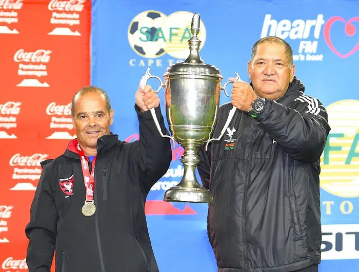 Hanover Park coach, Ralph Hendricks, and club chairman Rieduwaan Anthony holding the Coke Cup trophy.