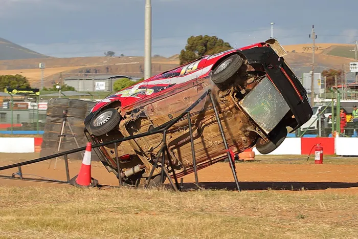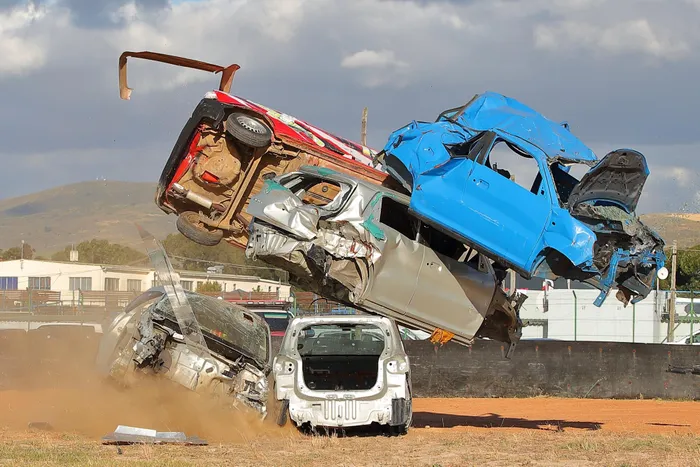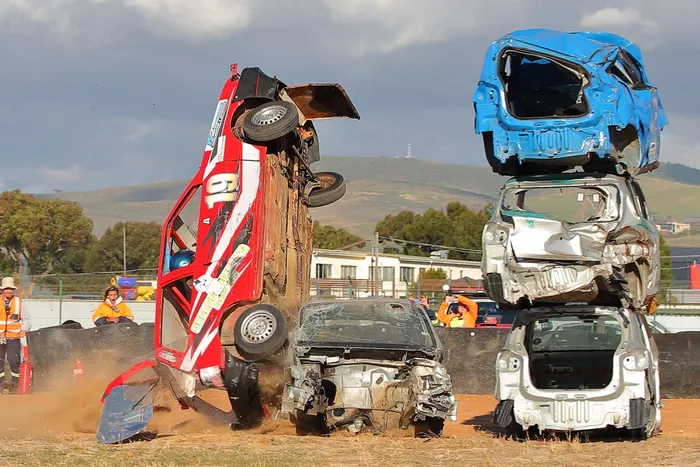 David Davadoss gives new meaning to multiple car pile up, during the Cape Hell Drivers' tribute to legendary stunt driver, Deon de Waal, at Killarney, on Saturday.