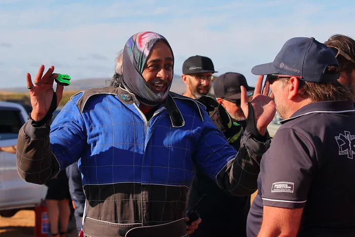 Smiles all around following David Davadoss' turn behind the wheel, in Saturday's Cape Hell Drivers' tribute to Deon de Waal, at Killarney, on Saturday.